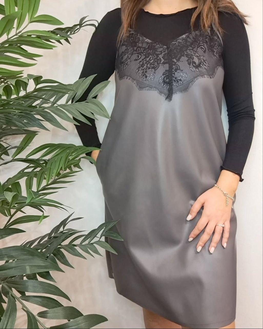 Vestito in simil pelle grigio con dettaglio in pizzo sulla scollatura.